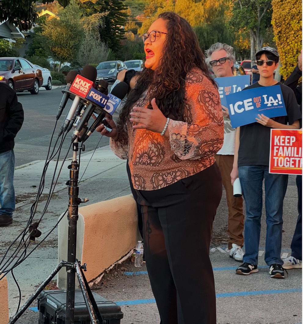 Community resistance to ICE and the Trump Presidency runs both deep and wide across L.A. That point resonated at the press conference, including in remarks by School Board Vice President Dr. Rocío Rivas to reporters from multiple news outlets. Having led successful efforts by LAUSD to keep ICE agents out of school sites, Rivas insisted on establishing channels of accountability for agents’ conduct or risk “impunity,” even for horrifying beatings or killing of residents, such as the murder of Renee Good on Jan. 7 in Minneapolis. Rivas later took part in the street protest in Highland Park, a community she represents. L.A. School Board member Karla Griego, who represents Eagle Rock, also took part in the press conference.