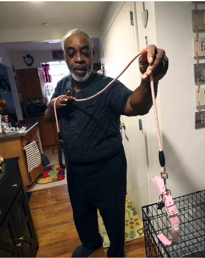 (Derrick Bradley holds up a pink leash and collar that broke during the attack.)