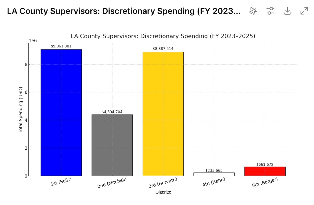 Solis (1st) – $9,061,081. The overpowering hose. Multi-hundred-thousand grants to big social-service institutions; Downtown Women’s Center ($3M), JWCH ($851K), Plaza de la Raza ($500K). It reads like a parallel county budget.