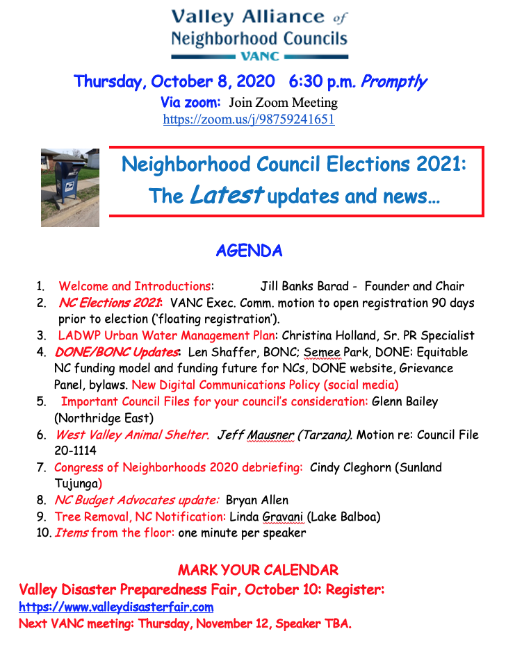 Our next regular meeting will be Thursday, October 8, 6:30 p.m. by zoom. The agenda is attached. Also I have attached an election schedule for NC elections in 2021. I look forward to seeing you on Thursday.Jill Barad, Founder and ChairTopic: Valley Alliance of Neighborhood Councils (VANC) MeetingTime: Sep 10, 2020 06:30 PM Pacific Time (US and Canada)Join Zoom MeetingMeeting ID: 987 5924 1651