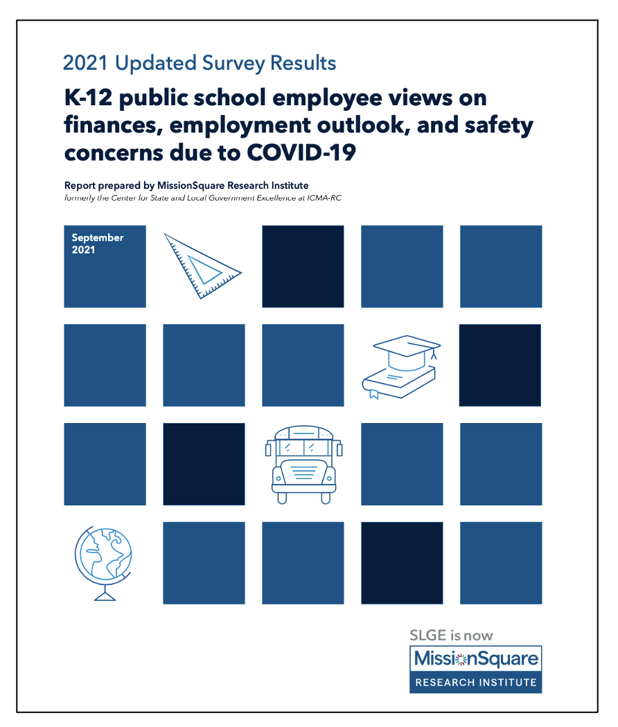 Please join us on Tuesday, September 28, 2021, at 1:00 p.m. ET for a review of a new report, 2021 Updated Survey Findings: K-12 Public School Employee Views on Finances, Employment Outlook and Safety Concerns Due to COVID-19.This report is from MissionSquare Research Institute(formerly the Center for State and Local Government Excellence at ICMA-RC).It finds that as schools begin to open across the nation amid growing concerns about the COVID-19 Delta variant, the K-12 workforce is more stressed, burnt out and anxious compared to other state and local employees. More than one-third (37%) of the K-12 workforce says that the pandemic has them considering a job change.K-12 employees are concerned about the impact of the pandemic on students — from falling behind in their education to experiencing problems with access to the internet and technology. This segment of the workforce also is feeling the financial pain of the pandemic more acutely than other state and local workers.