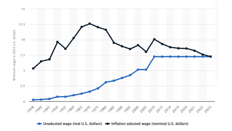 First, the main cause of growing homelessness and overcrowding in the United States is static real wages over the past half century. The following chart reveals that from 1970 to 2023 inflation-adjusted wages declined for most people in the United States. Until wage stagnation is addressed by inflation-matching raises, homelessness and overcrowding will continue to grow in the United States. While Senator Schiff’s legislative proposals might slow this increase, it will not reverse a trend that began under the Nixon administration in 1970.