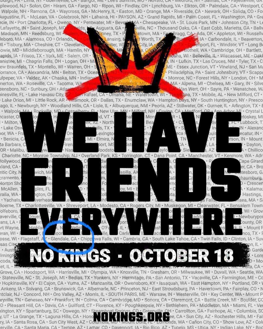 Here in L.A. County, one of the largest No Kings! events on 10/18 will occur at noon to 2 pm in Glendale on the large public plaza outside the Social Security office at 225 W. Broadway. Attendees can still sign up for the rally at this link.