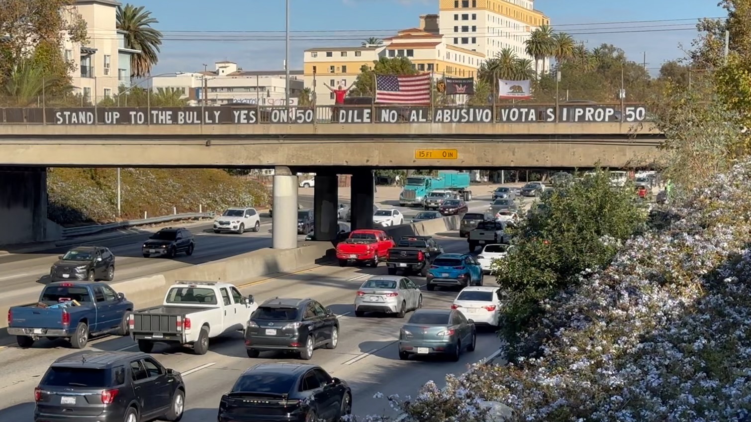 Weeks of spirited, ingenious get-out-the-vote activities by EAPD and others have mingled Yes on 50 messages with recruitment to No Kings! events. That includes several well-orchestrated visibility gatherings on freeway overpasses in Lincoln Heights, Silver Lake, and Eagle Rock. Thousands of drivers expressed their honking solidarity.