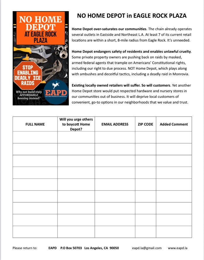 The petition, launched by East Area Progressive Democrats (EAPD) in November, follows California voters’ landslide approval of Prop 50 to push back against power-grabs by Donald Trump amid evidence of self-enrichment and corruption by his family and Administration. The measure passed nearly by a 2-to-1 margin statewide. It passed by a 3-to-1 margin in L.A. County, with overwhelming support from Democrats and independents and even from many Republicans. Local hardware retailers report that patrons across the ideological spectrum are signing the EAPD “NO Home Depot” petition.