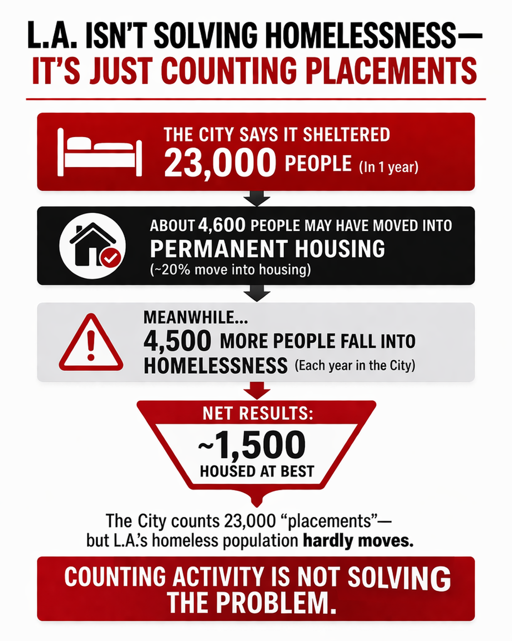 So, how did the City achieve a net reduction of 1,553 people if its programs, house 20 percent of those sheltered? The short answer to that question is nobody--including the City--knows how many people have been sheltered or housed. As I’ve written many times before, the City does not count people--it counts processes. When it says it sheltered 23,000 people, in reality the City completed 23,000 sheltering processes for a smaller, but unknown number, of unique individuals. It may count the number of times it completed a shelter placement, but it has no idea if the person placed is new or has been in the system one or more times. This is neither a new nor isolated problem. A 2019 City Controller audit noted, “Repeated housing placements for the same person or family falling in and out of homelessness during a year are included in the [number of people sheltered] figure”. Six years later, nothing had improved. A 2025 study from the League of Women Voters of Greater LA stated, “…neither the city nor the county, which work together in many ways in their approaches to homelessness, consistently track the housing trajectories of people who enter the homeless services system, specifically how they are placed, then exited, then placed again repeatedly across a variety of shelter or housing types in a “churning” cycle of placement and displacement from one temporary accommodation to another”.