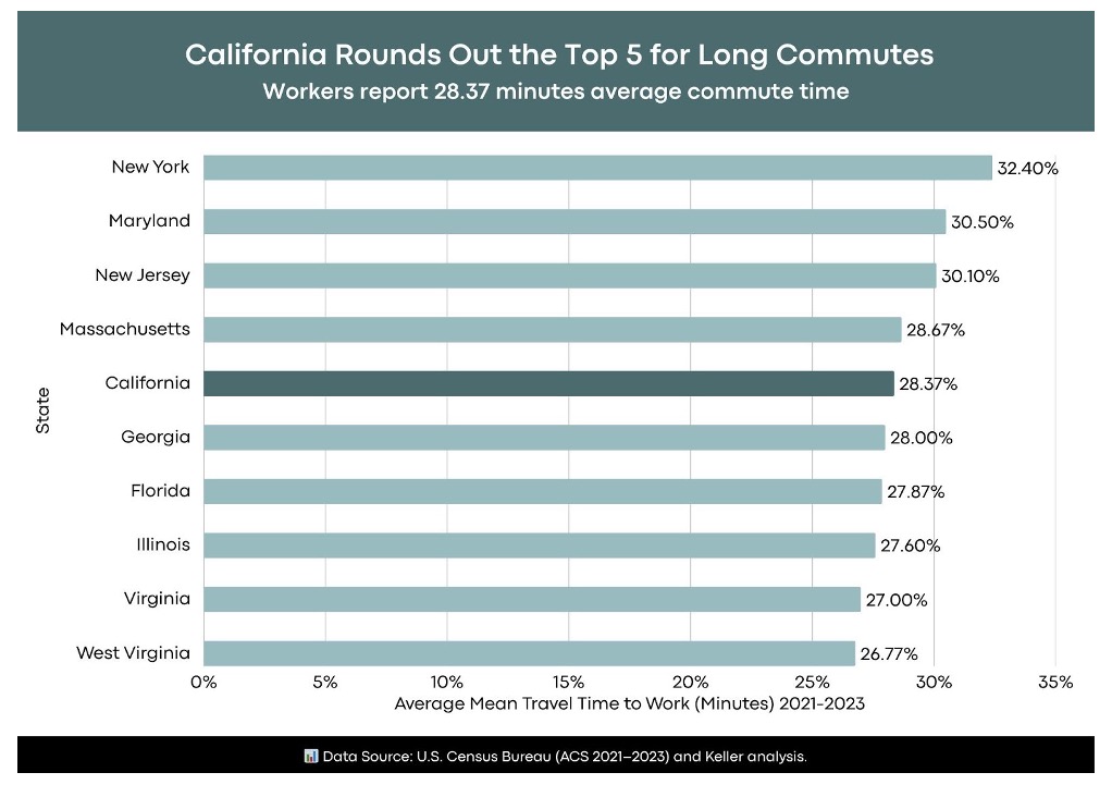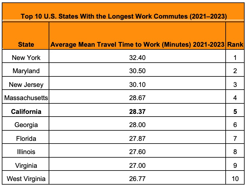 “California embodies America’s car-dependent commute culture. Los Angeles and the Bay Area, with sprawling suburbs and chronic congestion, drive up the state’s average even though smaller cities may experience shorter travel times.”