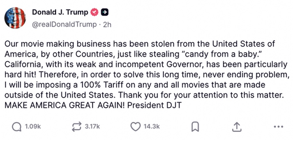 The former reality show host, now masquerading as president, is spinning his wheel of misfortune in promoting a dysfunctional approach to rebooting film and television production within the borders of the United States by again threatening to impose 100% tariffs on all entertainment crafted abroad.